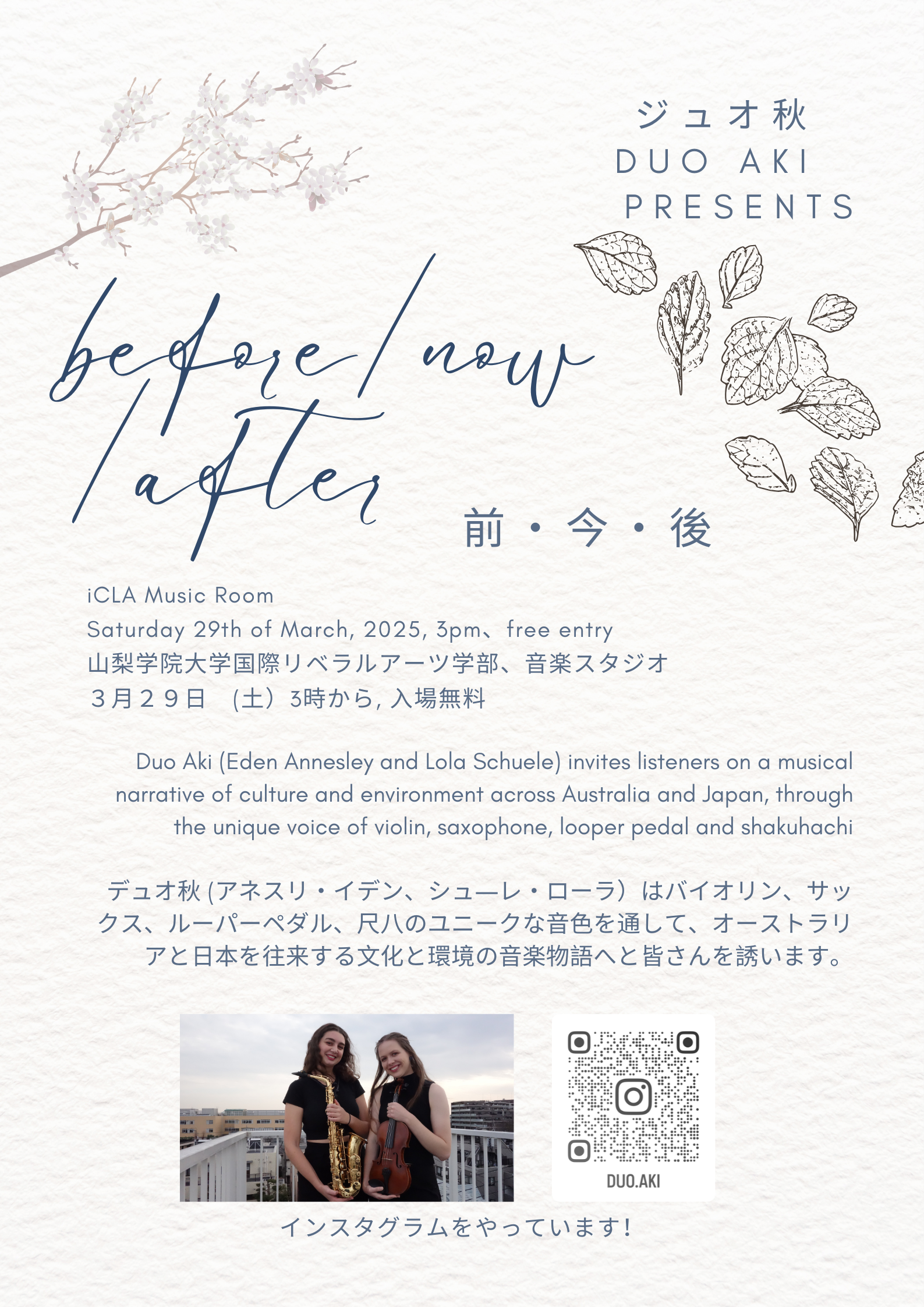 After a busy month of performance at the Expo, Duo Aki returned to Melbourne for a performance on home soil: live in Naarm/Melbourne on Friday 30th of May, 7pm, at the Mission to the Seafarers, Docklands.